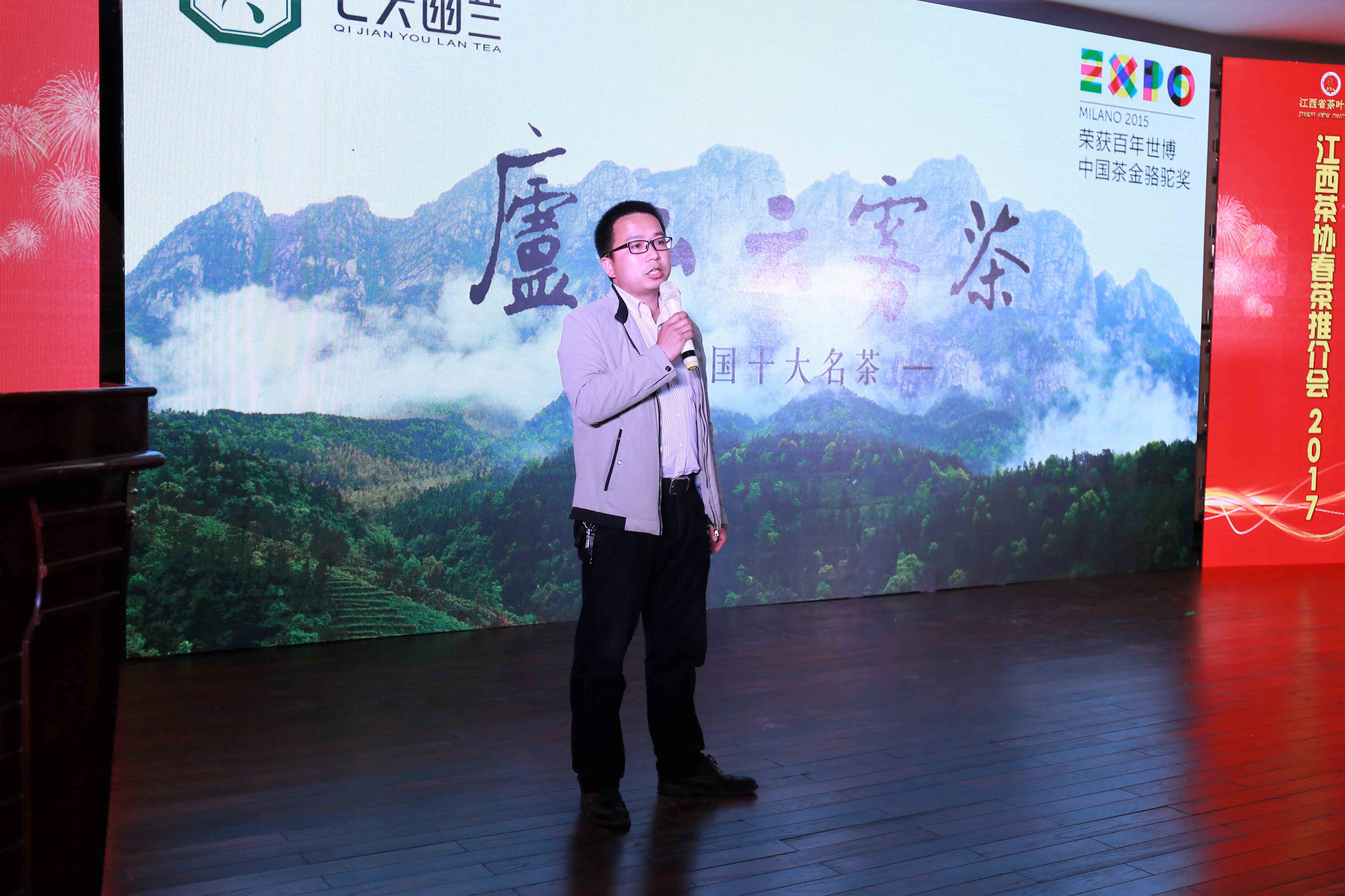 七尖幽兰庐山云雾茶经理于江斌与大家分享了庐山云雾茶的生长环境,并邀请大家前往种植基地参观考察。对于今天推介会的举办效果表示非常的出乎意料,因为这种推介会是非常创新的一种新模式,以前未曾举办过,活动还在筹备时还稍有担心,但是看到今天热闹的效果以及攒动的嘉宾就放心了。非常感谢在江西省茶叶协会举办了本次春茶推介会,既减轻了生产企业的生产压力,也降低了经销商的新茶采购压力及成本,这种创新是非常好的,对于茶行业是非常有意义的。