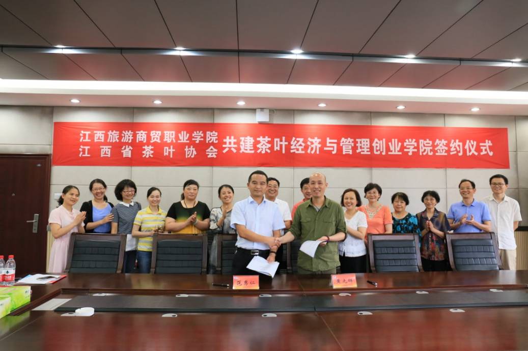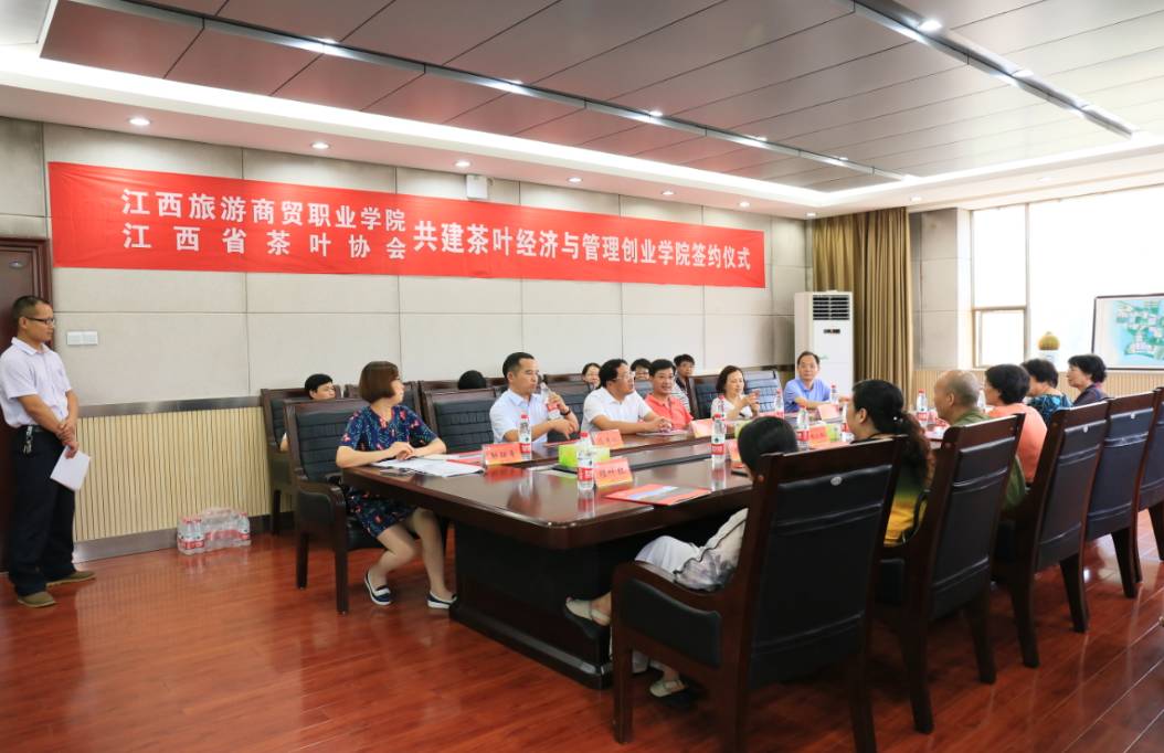 2017年7月5日,江西省茶叶协会与江西旅游商贸职业学院共建“茶叶经济与管理创业学院”举行了签约仪式。江西省茶叶协会会长黄光辉先生与江西旅游商贸职业学院党委书记、校长赵恒伯,党委委员、副校长范秀仁,经济管理学院院长陶广华,校企合作办主任邬劲青,校长助理文玉菊,经管学院王春风老师等在江西旅游商贸职业学院行政楼三楼会议室进行了友好的交流,黄光辉会长与范秀仁副校长分别代表合作双方在协议上签字。