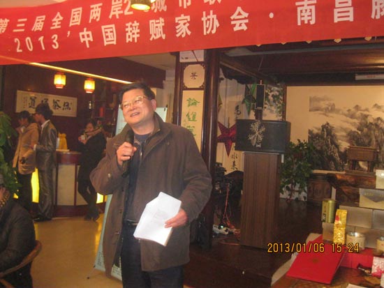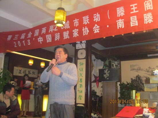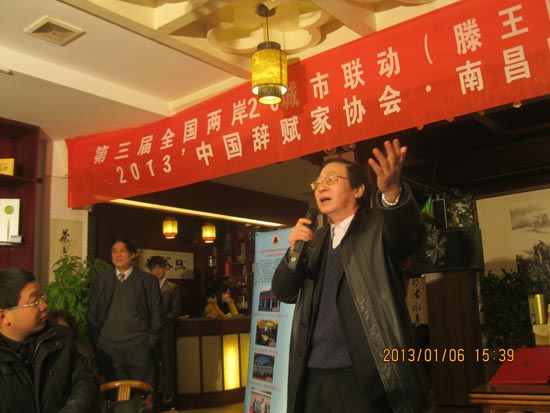 2013年1月6日下午由海峡两岸茶业交流协会、《海峡茶道》杂志社主办,中国辞赋家协会、滕王阁辞赋研究所承办的2013笫三届全国两岸20城市联动迎春品茗诗会南昌站分会场,在滕王阁茶馆举行。参加会议的有耒自省市文艺、书昼、诗辞、茶业团体协会负责人等文人茶友80余人参加品茗诗会。会议由中国辞赋家协会秘书长、共青学院院长、滕王阁辞赋研所所长张友茂主持。在品茗赋诗、饫雪煮茗、茶墨飘香、茶里听琴中,省市新老作家、书昼家,著名歌唱、表演艺术、挥毫泼墨,在三个小时的欢乐中,高歌迎春其乐融融,欢声笑语中喜迎新春!
