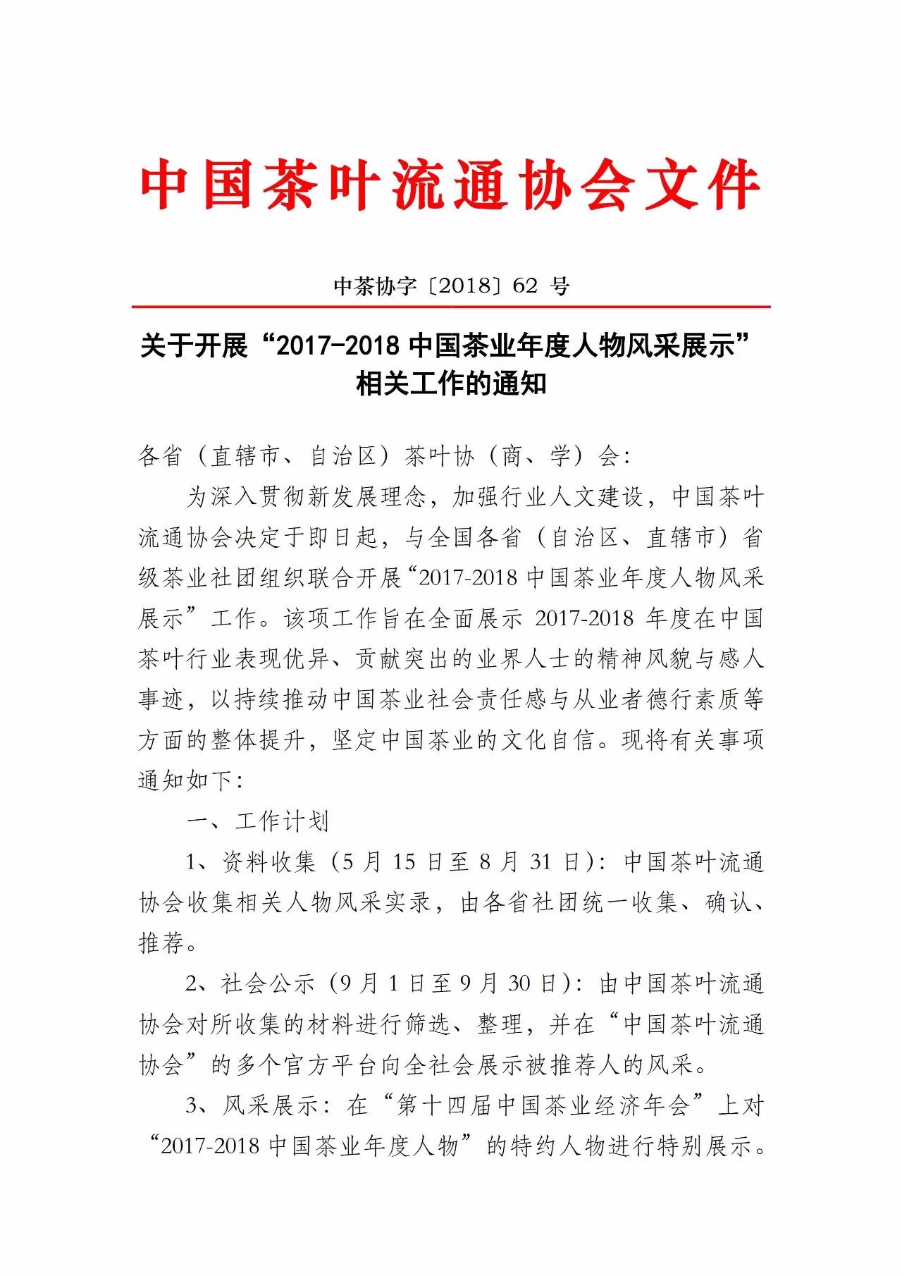 为深入贯彻新发展理念,加强行业人文建设,中国茶叶流通协会决定于即日起,与全国各省(自治区、直辖市)省级茶业社团组织联合开展“2017-2018中国茶业年度人物风采展示”工作。该项工作旨在全面展示2017-2018年度中国茶叶行业表现优异、贡献突出的业界人士的精神风貌与感人事迹,以持续推动中国茶业社会责任感与从业者德行素质等方面的整体提升,坚定中国茶业的文化自信。