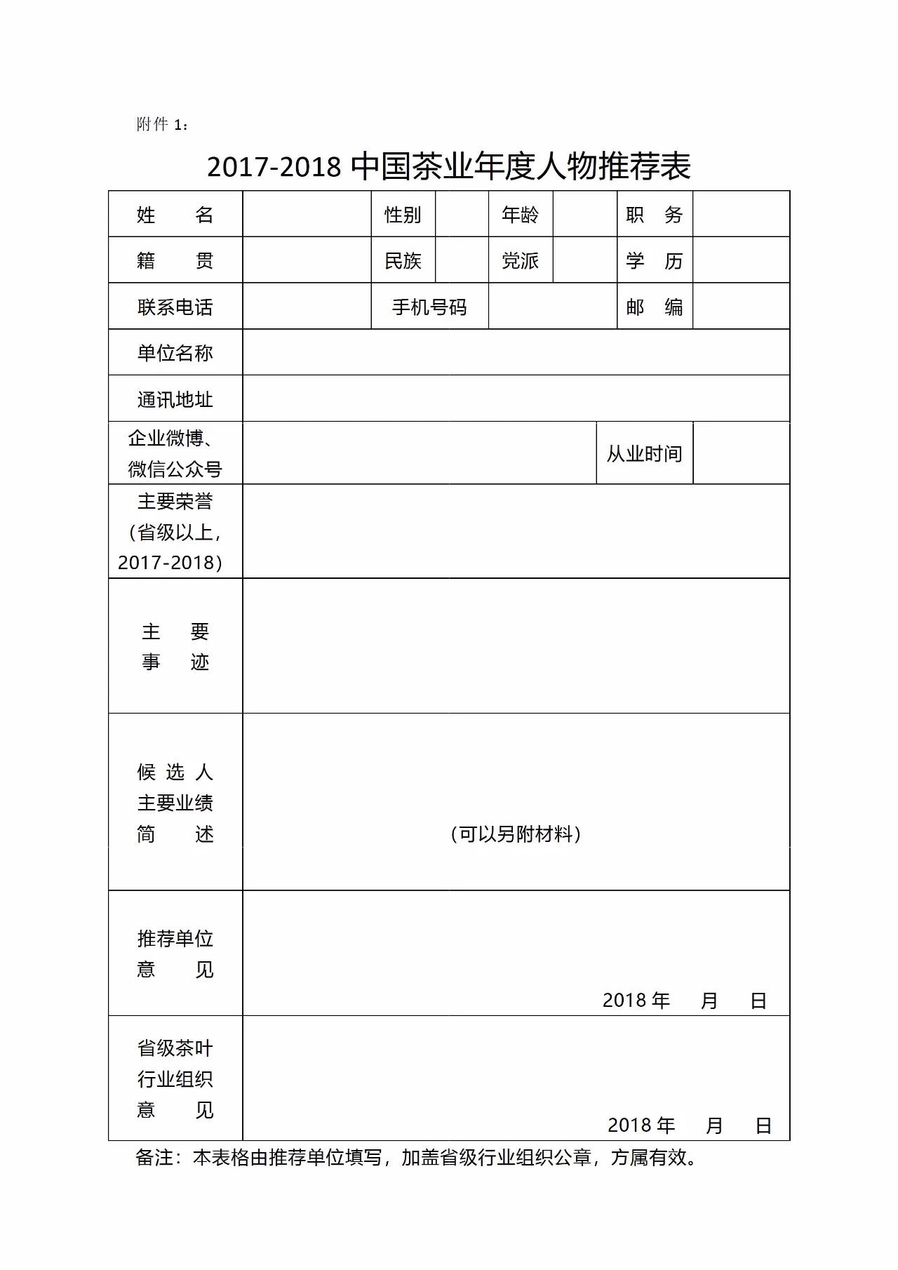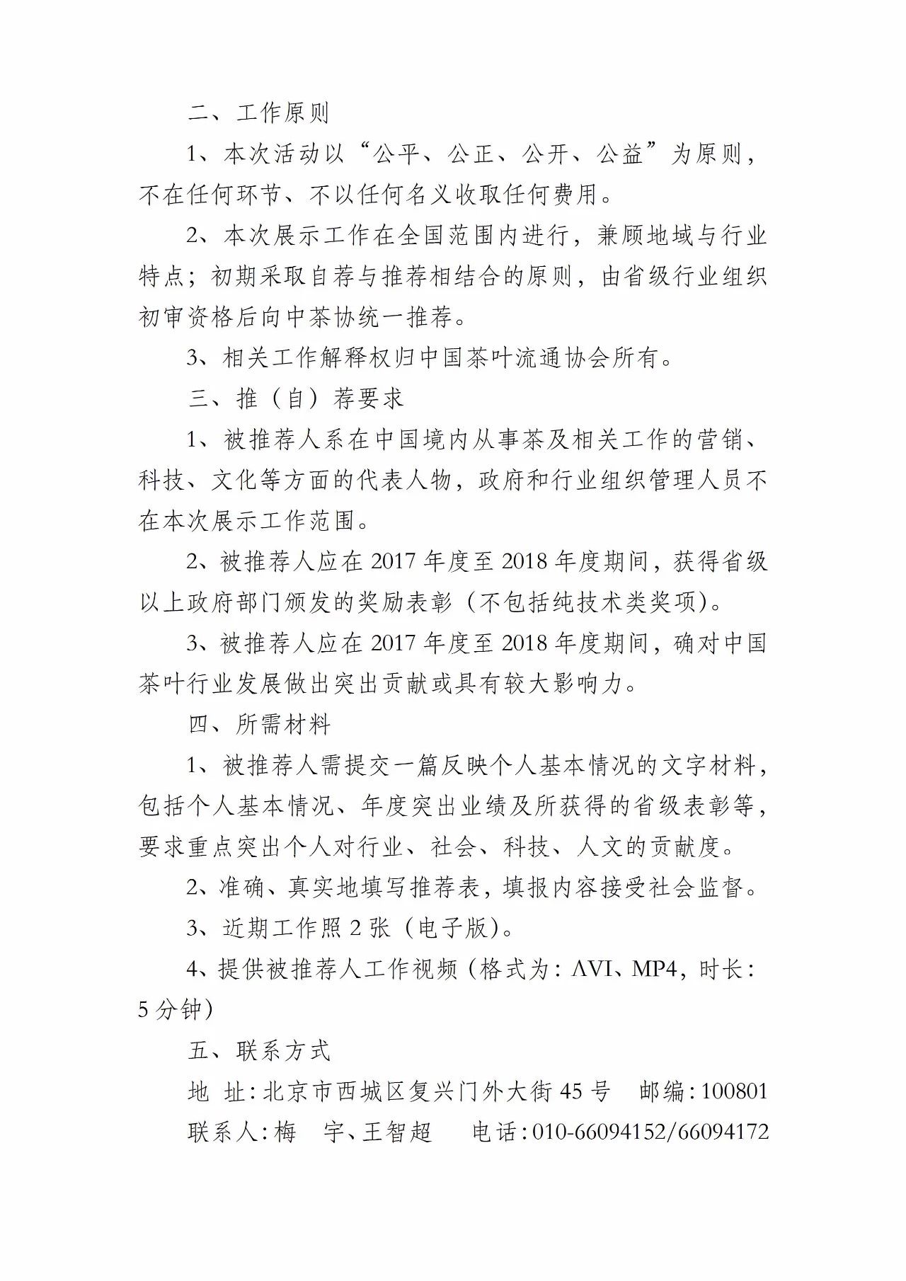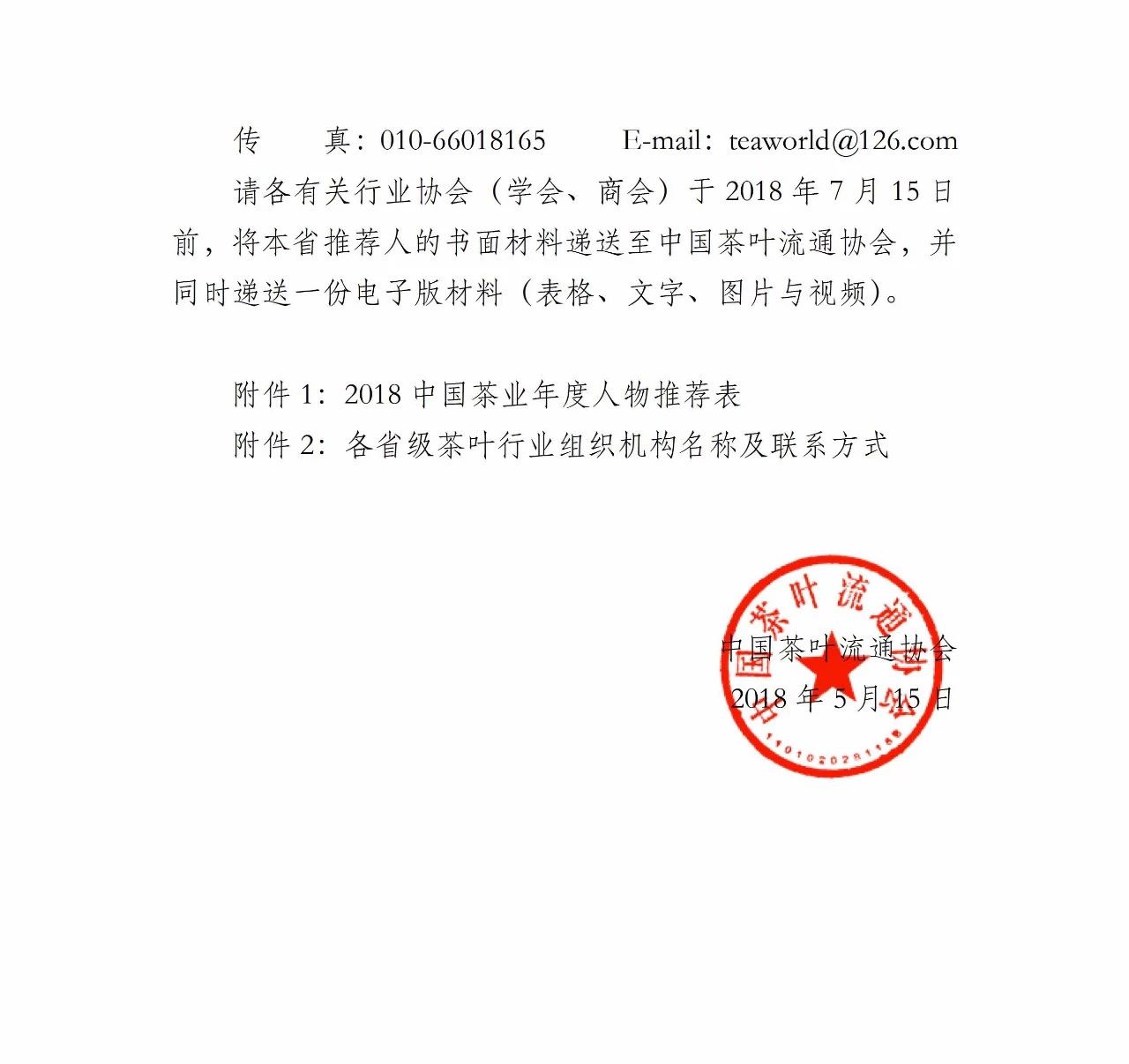 江西省区域申报工作由江西省茶叶协会展开,各推(自)荐人(从事茶及相关工作的营销、科技、文化等方面的代表人物)请在2018年7月10日前与江西省茶叶协会办公室联系,将材料发至江西省茶叶协会办公室邮箱。