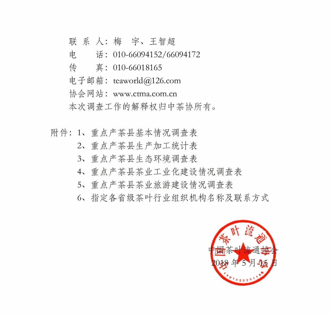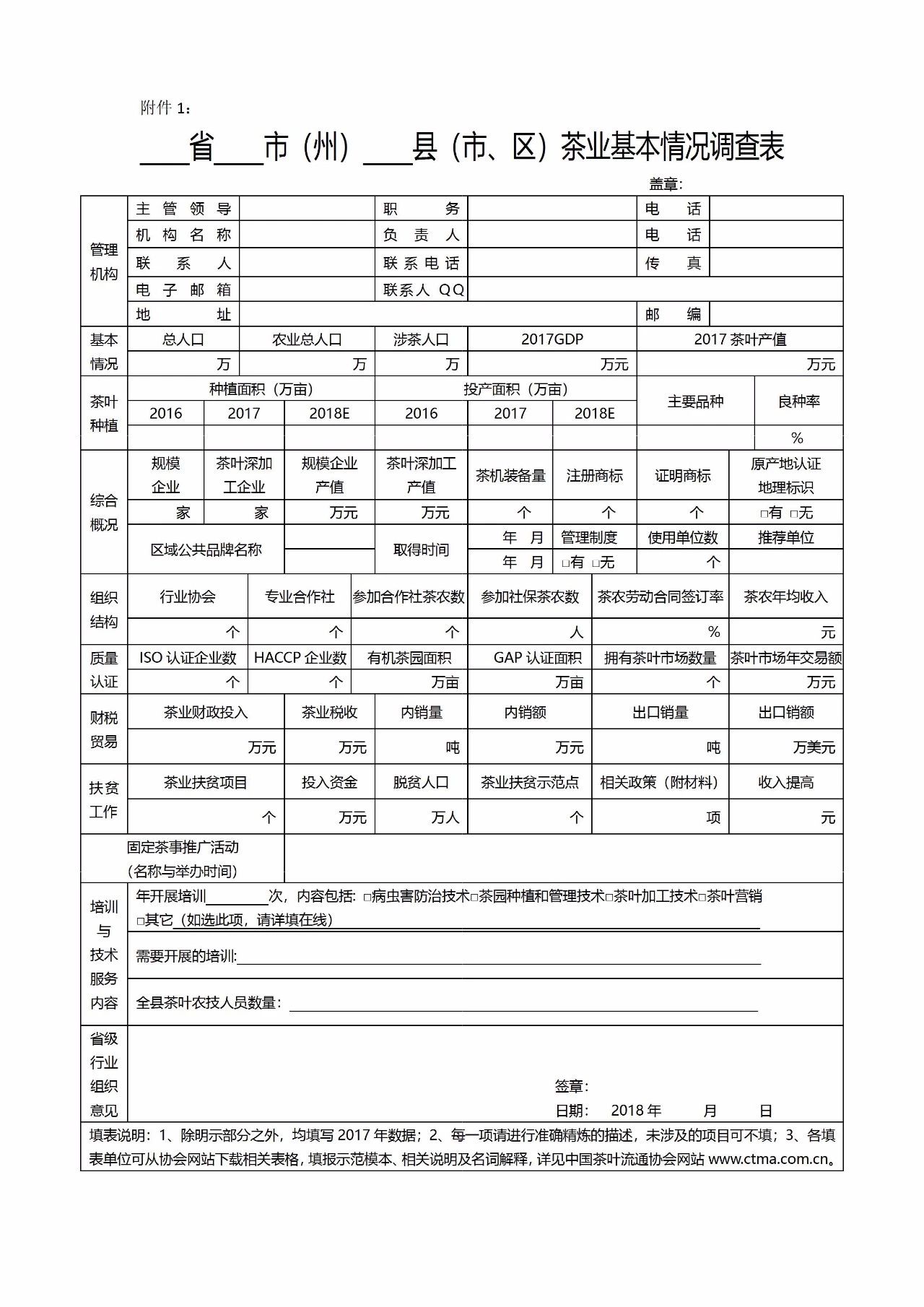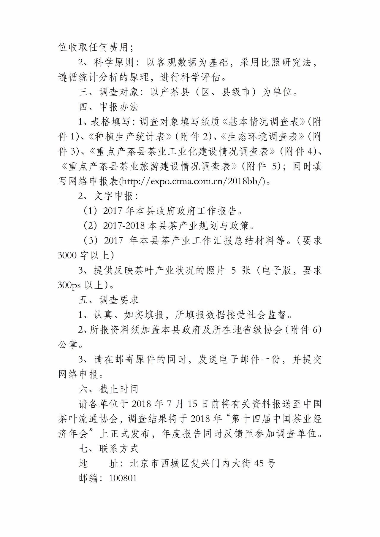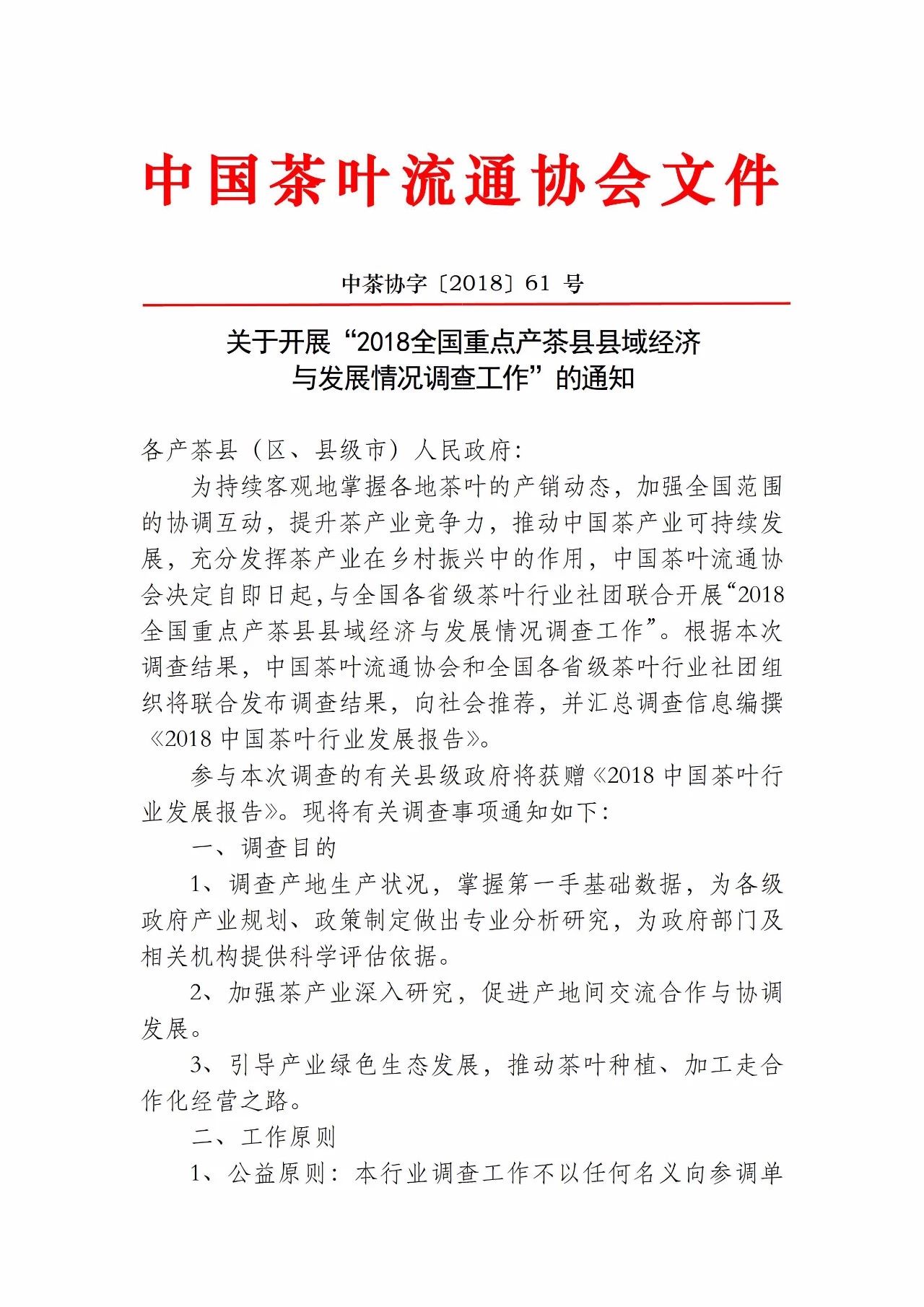 为持续客观地掌握各地茶叶的产销动态,加强全国范围的协调互动,提升茶产业竞争力,推动中国茶产业可持续发展,充分发挥茶产业在乡村振兴中的作用,中国茶叶流通协会决定自即日起,与全国各省级茶叶协会社团联合开展“2018全国重点产茶县县域经济与发展情况调查工作”。