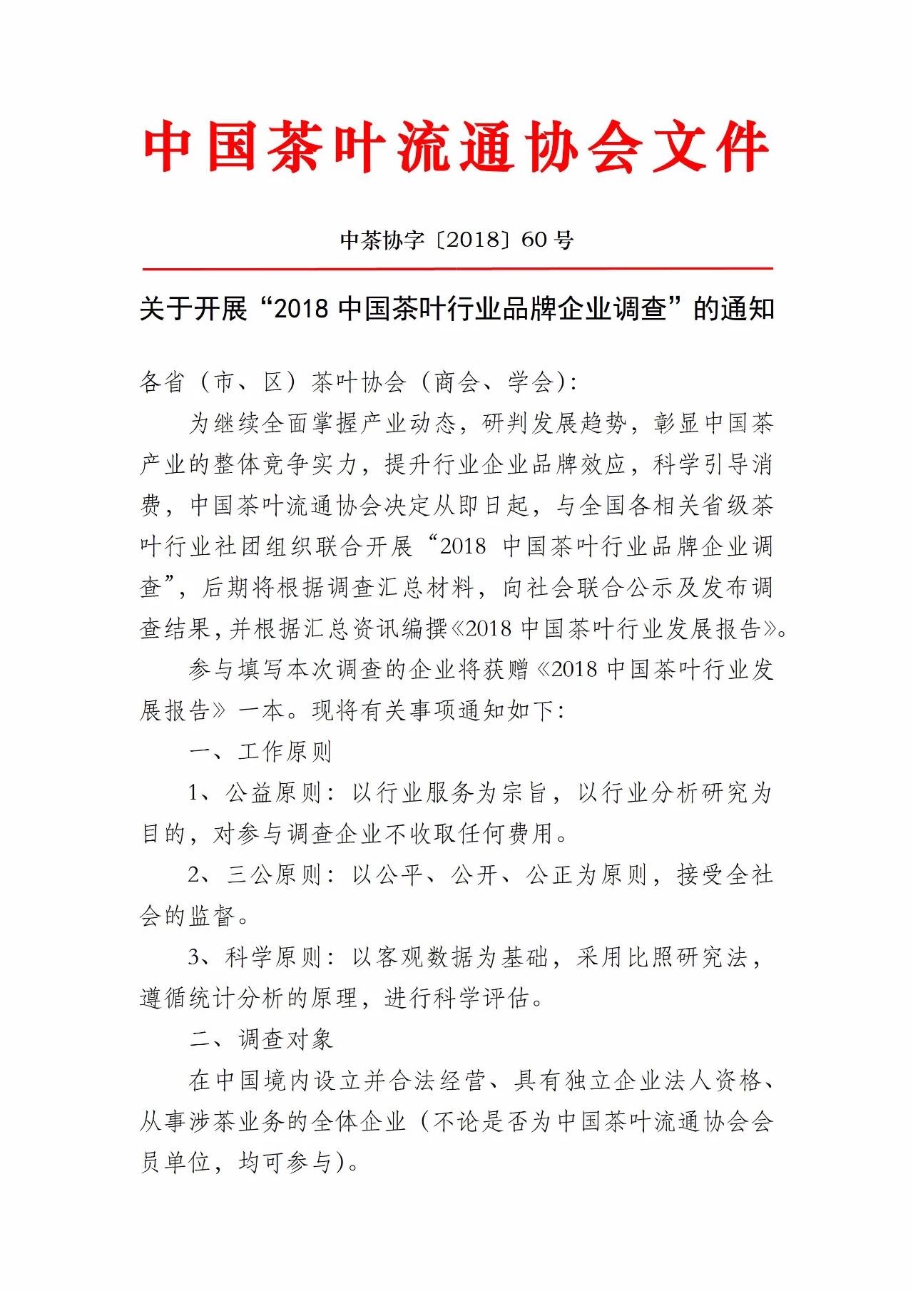 为继续全面掌握产业动态,研判发展趋势,彰显中国茶产业的整体竞争实力,提升行业企业品牌效应,科学引导消费,中国茶叶流通协会决定从即日起,与全国各相关省级茶叶行业社团组织联合开展“2018中国茶叶行业品牌企业调查”,后期将根据调查汇总材料,向社会联合公示及发布调查结果,并根据汇总资讯编撰《2018中国茶叶行业发展报告》。